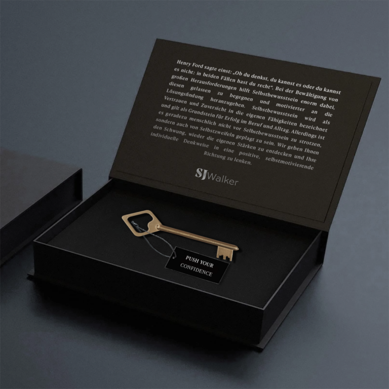 Die edle schwarze Geschenkbox beinhaltet einen hochwertigen goldenen Schlüssel mit dem Tag “Push your confidence”. Zudem gibt es einen Umschlag mit den Anweisungen zum Einlöseprozess des Gutscheins. Die Produktbeschreibung steht als positive Botschaft auf dem Deckel der Box.